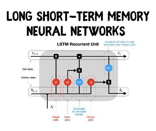 Figura 5: Red neuronal recurrente con un solo input y output. Vemos como la información de la neurona en la capa oculta regresa a sí misma y como puede desdoblarse, truco que permite ver a este tipo de redes como una red neuronal típica. A su lado tenemos una neurona LSTM, básicamente funciona a través de estructuras (gates) que controlan cuánta información del pasado se elimina, cuánta información del tiempo actual se utiliza y cuál información se usa para la salida y cuál pasa a formar parte de la memoria para usarse en el siguiente tiempo.