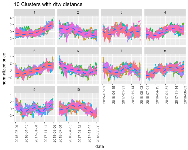 Figura 6: Clustering de series temporales a partir de una distancia de tipo DTW apropiada para estos datos (Dynamic time warping) con la cual podemos identificar los elementos en cada cluster que pueden corresponder a comportamientos similares dentro de un grupo a través del tiempo. La línea punteada es el centroide, una serie representante de cada cluster.